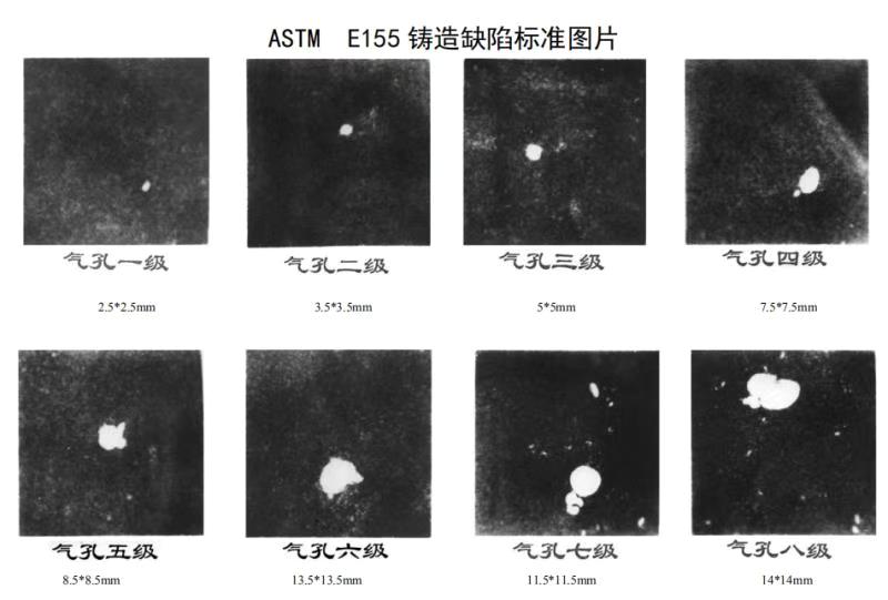 工业件体积大,探测面积也大,个别不在关键位置的小气孔对铸件的影响其实并不大,那为何还要进行X射线无损检测呢?其实检测的目的并不是仅仅发现小气孔,而是检测其内部是否存在连成一片密集的疏松面,这样的缺陷就比较严重。国内工业起步较早,国内、国际的相关标准也比较完善,下面是STM的国际铸造缺陷图,它是一个用来衡量缺陷的标准。