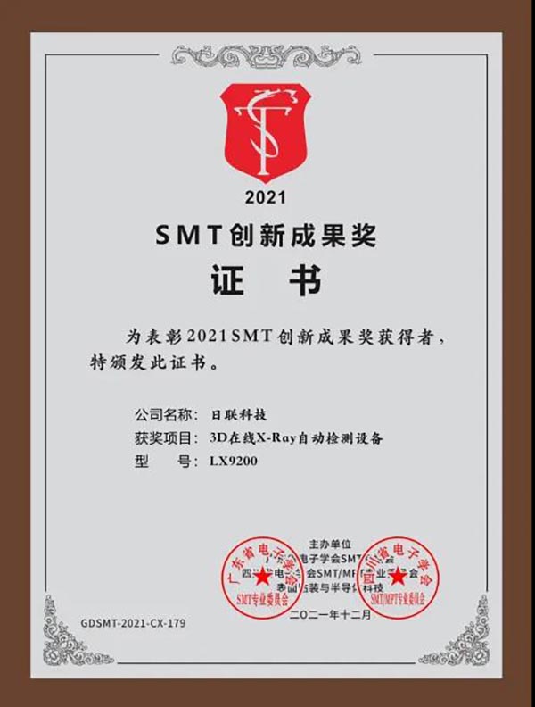 在中国SMT创新成果颁奖典礼上,米兰·(milan)科技研制的LX9200在线X射线自动检测装备凭借重大技术创新点及行业专家学者一致评定,荣获“2021中国SMT创新成果奖”,这也是米兰·(milan)科技连续12年获得该奖项。